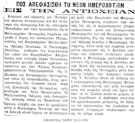 "Εν τη δευτέρα μετά της Α. Μ. (Αυτού Μακαριότητος) συνομιλία πρώτη αυτή εμνήσθη του ζητήματος του Ν. Ημερολογίου και εζήτησε την περί τούτου γνώμη μου. Εδήλωσα αυτήν απροκαλύπτως προσθείς, ότι μετά την επελθούσαν μεταβολήν του Πολιτικού Ημερολογίου η μεταβολή του Εκκλησιαστικού κατέστη απαραιτήτως αναγκαία, είναι δε γνωστόν ότι ουδείς λόγος δογματικός απαγορεύει την μεταβολήν ταύτην. Υπέμνησα την πράξιν της αρχαίας Εκκλησίας, ήτις δεν εδημιούργησεν Ημερολόγιον, αλλ' έλαβε το της Πολιτείας, εν η ενεφανίσθη, και ετόνισα τα άτοπα εκ της χρήσεως υπό των χριστιανών δύο ημερολογίων, καθόσον η Α. Μ. μοι προσήγαγε το παράδειγμα των Ιουδαίων, διατηρούντων χωριστά το θρησκευτικόν από του πολιτικού χωρίς να λάβη υπ' όψιν, ότι οι Ιουδαίοι ελαχίστας έχουσι θρησκευτικάς εορτάς κατ' έτος, ενώ ημείς πολλάς κατά μήνα. Κατά τα ανταλλαγέντα η Α. Μ. ως μόνην δικαιολογίαν της εμμονής της Αντιοχικής Εκκλησίας εις το Π. Ημερολόγιον ανέφερε πρώτον μεν την αμάθειαν του γηγενούς πληθυσμού, έπειτα δε την χρησιμοποίησιν της μεταβολής υπό των Ουνιτών χάριν προσηλυτισμού. ΟΥΤΩΣ ΑΥΤΟΣ Ο ΝΟΥΝΤΣΙΟΣ ΤΟΥ ΠΑΠΑ ΕΝ ΣΥΡΙΑ ΜΕΤΑ ΤΗΝ ΕΙΣΑΓΩΓΗ ΤΟΥ Ν. Η. ΕΙΣ ΤΑΣ ΟΡΘΟΔΟΞΟΥΣ ΕΚΚΛΗΣΙΑΣ ΕΓΡΑΨΕΝ ΕΓΚΥΚΛΙΟΝ ΕΝ Η ΕΛΕΓΕΝ ΟΤΙ ΗΔΗ ΔΙΑ ΤΗΣ ΜΕΤΑΒΟΛΗΣ ΤΑΥΤΗΣ ΟΙ ΟΡΘΟΔΟΞΟΙ ΑΝΕΓΝΩΡΙΣΑΝ ΤΟ ΔΙΚΑΙΟΝ ΤΗΣ ΠΑΠΙΚΗΣ ΕΚΚΛΗΣΙΑΣ ΚΑΙ ΠΡΟΪΟΝΤΟΣ ΤΟΥ ΧΡΟΝΟΥ ΘΑ ΑΝΑΓΝΩΡΙΣΩΣΙ ΚΑΙ ΤΑ ΑΛΛΑ ΑΥΤΗΣ ΔΙΚΑΙΑ. Αν επομένως η Αντιοχική Εκκλησία επιμένη εις το Π. Η., ο λόγος είνε, ότι αύτη ουδεμίαν έχει πεποίθησιν εις την σταθερότητα εν τη πίστει των πνευματικών αυτής τέκνων και το Ημερολόγιων θεωρούντων εν εκ των δογμάτων αυτής. Και πράγματι ο μεγαλείτερος κίνδυνος, ον διατρέχει η ορθόδοξος Αντιοχική Εκκλησία είναι η εκ της Ρωμαϊκής Προπαγάνδας και δη μετά την Γαλλικήν κατοχήν, καθόσον η Κυβέρνησις αντλούσα την εν τη χώρα υποστήριξιν αυτής εκ των Μαρωνιτών ιδία και των Ελληνοκαθολικών αμέριστον παρέχει την προτίμησιν αυτής εις αυτούς έναντι των Ορθοδόξων".